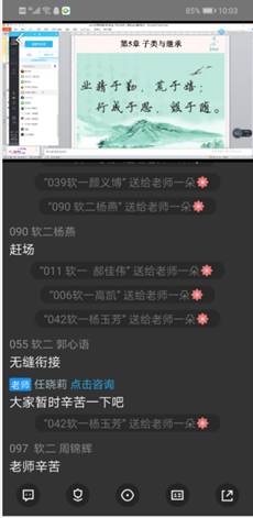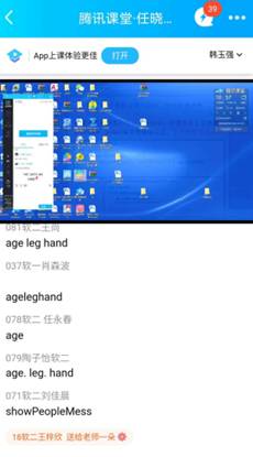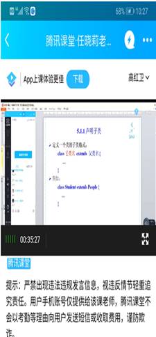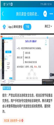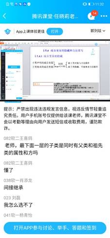 今天听计算机学院任晓莉老师的在线课程的感受:课堂讲解思路清晰,表达流畅,互动良好,偶尔有卡顿现象。通过听任老师的课,也亲身感受了学生在腾讯课堂app上课的感觉,我自己也在用腾讯课堂直播,为提高和完善自己课程各个环节的设计提供了灵感。
