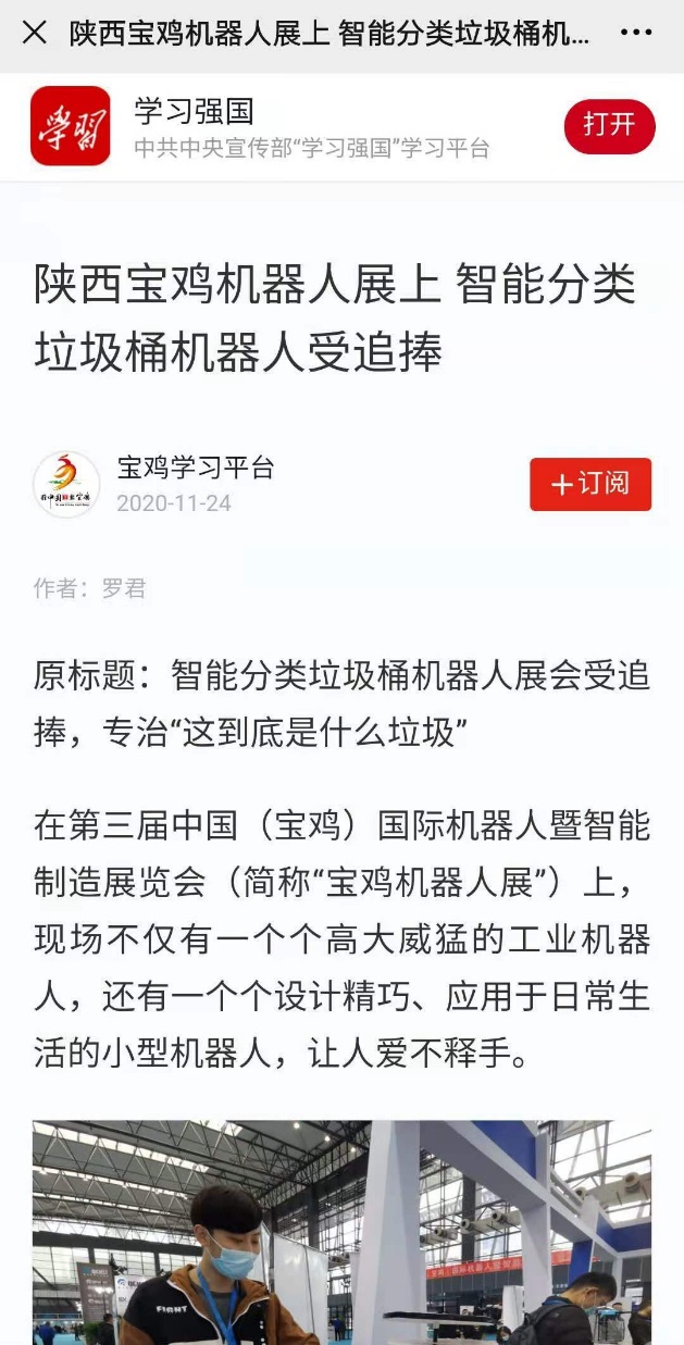 近日,我院学生自主研发设计的“智能分类垃圾桶机器人”在第三届中国(宝鸡)国际机器人暨智能制造展览会上受追捧,并被宝鸡学习平台推送上学习强国。