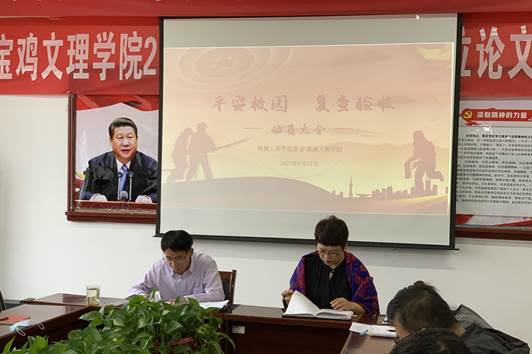 会上,李建峰首先传达了学校省级“平安校园”复审工作动员大会会议精神,并根据《我校开展省级“平安校园”复审工作实施方案》文件,部署了学院开展“创建平安校园”相关工作。一是成立学院“平安校园”复审工作领导小组,制定《9999js金沙老品牌开展省级“平安校园”复审工作实施方案》;二是明确了学院“平安校园”复审工作责任人工作重点,目标措施及要求;三是进一步完善各项安全制度,结合学院具体工作,分析学院安全形势,全面排查各类安全隐患,签订安全承诺书,夯实安全责任,落实好常态化疫情防控工作;四是在中秋节前,各实验室负责人,班主任,辅导员学生干部要深入实验室,学生宿舍进行安全检查,密切关注各类特殊群体。组织开展小型,分散的校园文化活动,丰富学生的假期生活,确保全院师生过一个温馨,安全的中秋佳节。